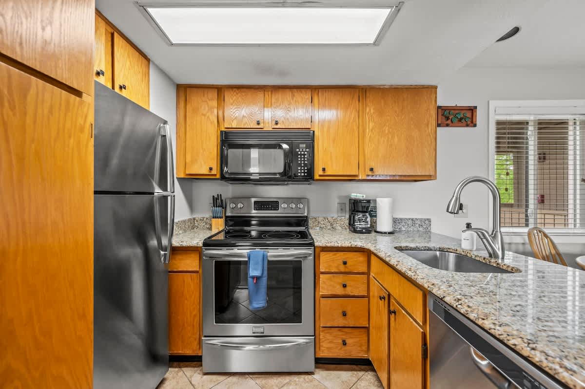 - Full-size refrigerator, oven/stove, microwave & dishwasher