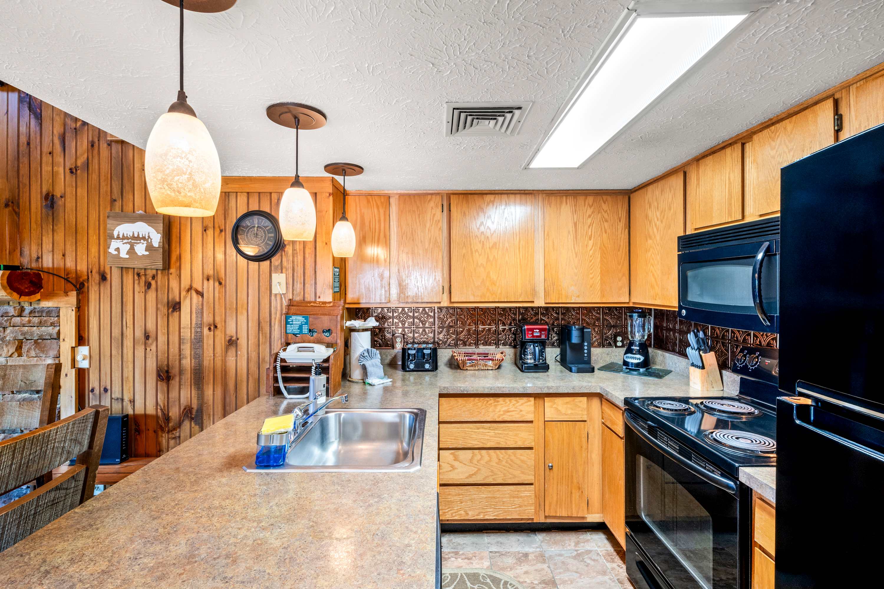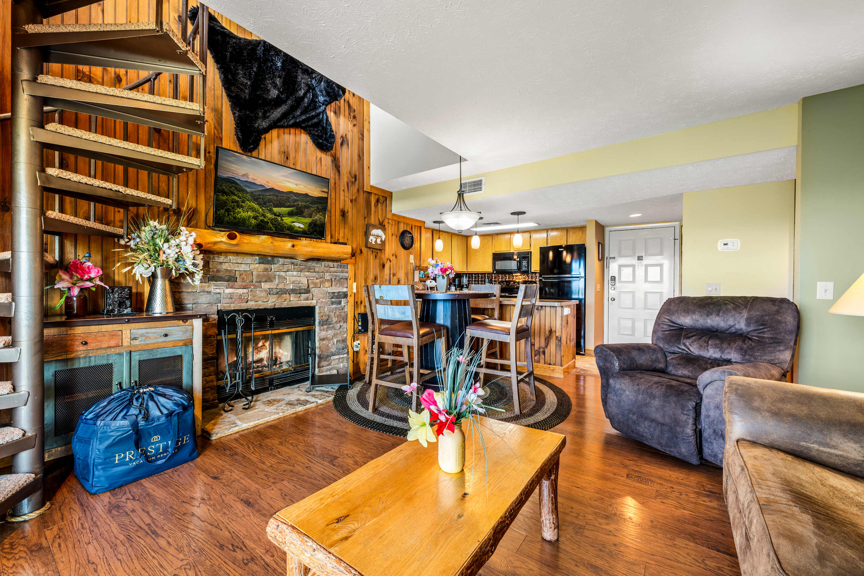 Step into a warm, inviting living area with a stone fireplace, comfortable seating, and a sleeper sofa—perfect for relaxing after a day of exploring Gatlinburg or hiking the nearby national park. A spiral staircase leads to the open loft with two twin beds—a great space for kids or extra guests. While the loft is open to the living area, it’s tucked out of view for privacy. Enjoy meals together in the fully equipped kitchen, then unwind on your private balcony with chairs overlooking miles of Smoky Mountain scenery.