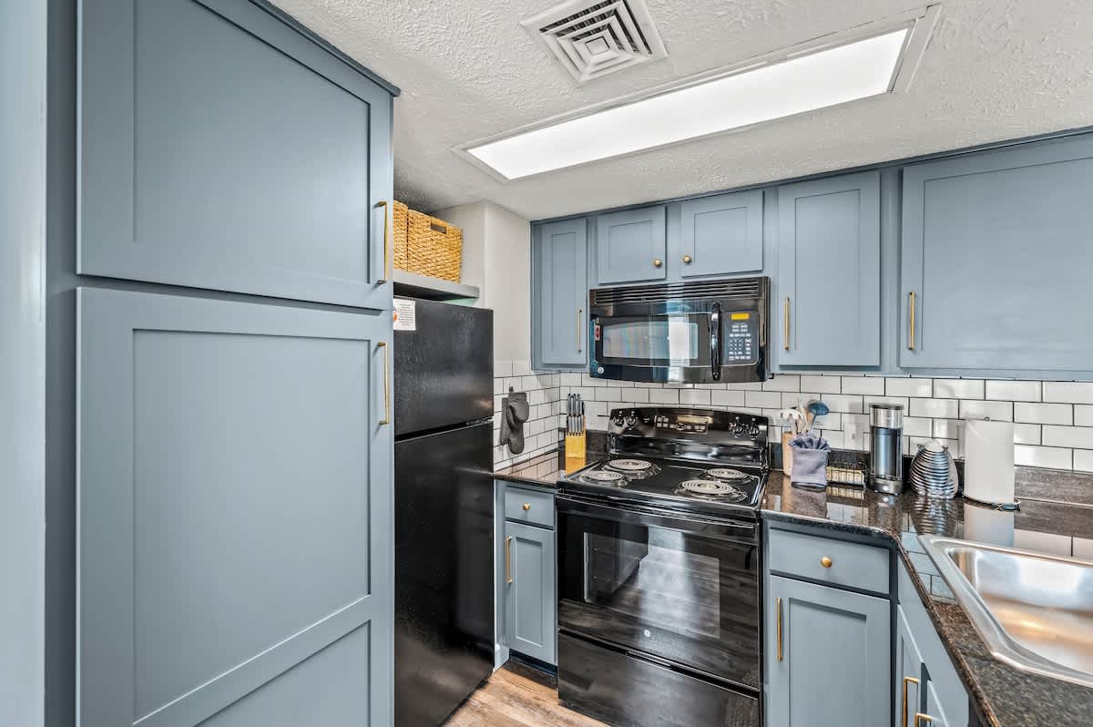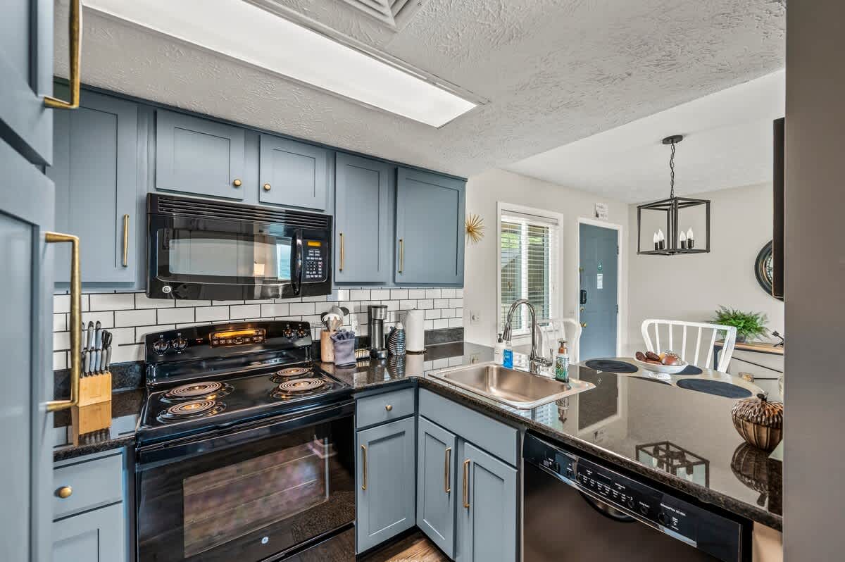 - Full-size refrigerator, oven/stove, microwave & dishwasher