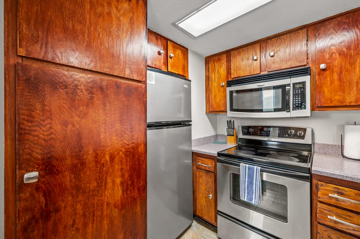 - Full-size refrigerator, oven/stove, microwave & dishwasher